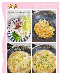 - 肉类(如猪肉片)煸炒至变色,加入香菇、金针菇、白菜翻炒至软烂。
