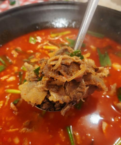 牛肉煮制:焯水牛肉加入酸汤炖1小时 → 放豆腐、金针菇等蔬菜再煮5分钟。