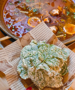 传统贵州酸汤火锅搭配小米辣酱、蒜泥、香菜,提升风味。