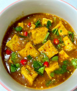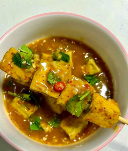 5. 把煎好的豆腐放入酱汁里蘸汁食用。