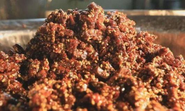 制作过程鲜橙去皮、籽,取汁加入白糖、花椒粉、胡椒粉、丁香粉、茴香粉、八角粉、酱油、猪油,调成果汁味料。