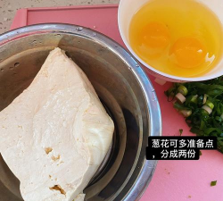 出锅装盘将煎好的豆腐鸡蛋液倒出来,装进盘子里,表面淋上绿葱花点缀。
