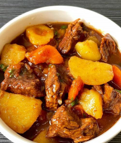 5. 当牛腩炖至七八分熟时,加入土豆块,轻轻翻拌一下,使土豆块与牛肉和汤汁充分混合。