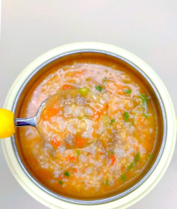 根据宝宝年龄调整粥的稠度,7-8个月龄宝宝可尝试七倍粥(米与水比例为1:7);