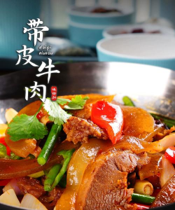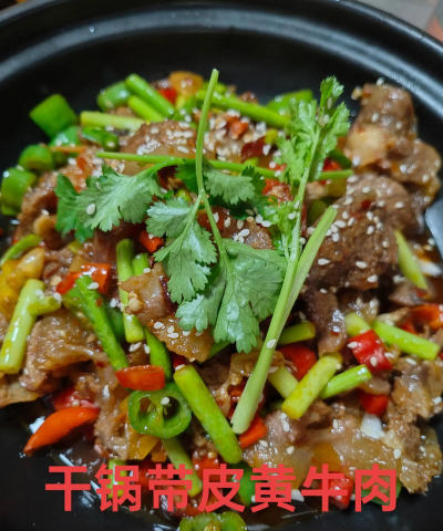 干锅带皮黄牛肉将带皮牛肉洗净,入锅内煮至断生,捞出切成4厘米长,2.5厘米宽,0.5厘米厚的片待用。