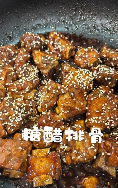 - 收汁至汤汁浓稠、排骨裹满酱汁时,撒上白芝麻和葱花即可出锅。