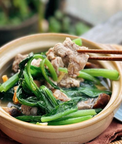 这样一道清淡甘香、爽口不油腻的潮汕春菜排骨煲就完成了。春菜的苦味能中和排骨的油腻,形成独特的鲜味层次,非常适合春天潮湿天气食用。