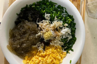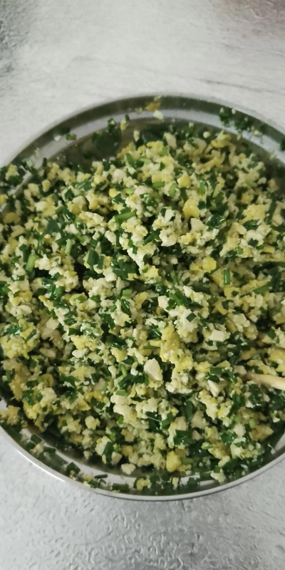 将晾凉的鸡蛋碎、豆腐丁与韭菜末混合