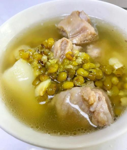 所需材料: 绿豆500克、猪排骨500克、山药200克、盐、味精。