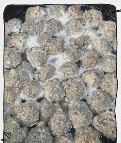 制作肉丸加入适量盐、木薯粉(或蕉芋粉),反复揉搓,搓成一粒粒拇指大的肉丸。