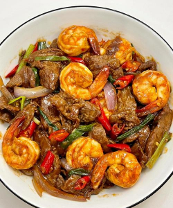 通过以上步骤,可做出色香味俱全的牛肉爆大虾,搭配米饭食用更佳。