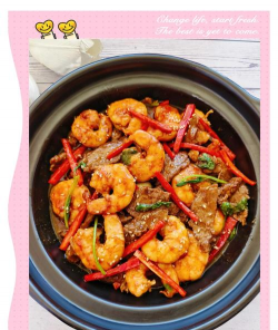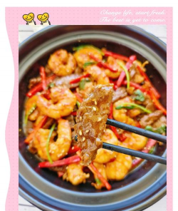 - 最后加入大虾仁,大火翻炒至虾仁变色,汤汁浓稠即可出锅