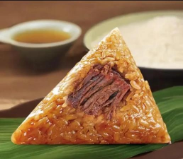 6. 取一张粽子叶,折叠成漏斗状,填入粽子料。