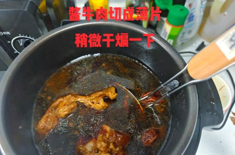 - 加入焯水后的牛肉,翻炒均匀后倒入开水(水量要没过牛肉2寸)