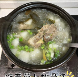 营养丰富:排骨提供优质蛋白,海带含碘和膳食纤维,萝卜补充维生素C和膳食纤维。- 功效:此汤具有补虚强身、清热化痰、促进消化等作用,适合冬季食用。