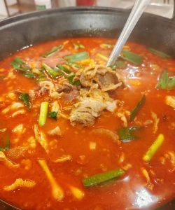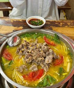将煮熟的牛肉片和其他食材放入火锅中,加入适量的酸汤,即可上桌享用。