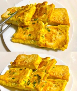 - 平底锅加适量油,小火煎豆腐至一面金黄(每面约3-4分钟),盛出备用。
