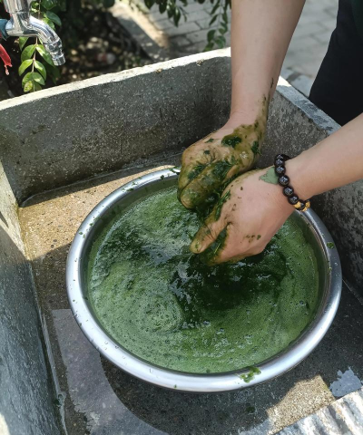 提取果胶将浸泡好的观音叶倒入一张白布内,然后四角收拢成圆球状,用双手反复揉搓挤压,直至挤压出绿色的汁液。根据个人口味控制用水量,喜欢嫩一点的观音豆腐就多加一些水,反之则少加水。