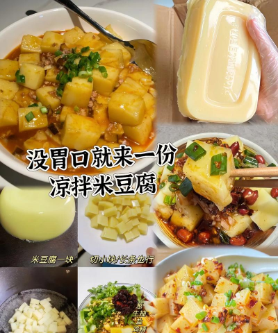 冷却成型的米豆腐可以切成小块或条状,根据个人口味选择不同的佐料进行凉拌或炒拌,口感更佳。