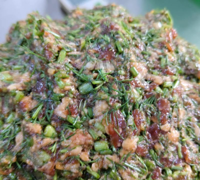 - 茴香切碎后用香油拌匀防止出水,与其他蔬菜(香菇、胡萝卜、小油菜)混合,加入鸡蛋、盐、蚝油等调味。3. 包制与煮制