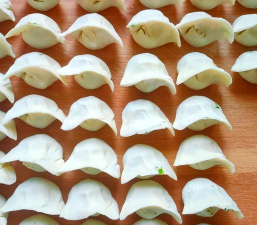 - 取饺子皮放馅料,捏成饺子形状,注意收口要紧。3. 煮制