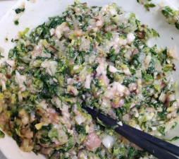 - 蔬菜切碎后焯水挤干水分,与香菇丁混合;