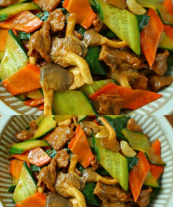 二、清爽炒鸡腿菇黄瓜片 特点: 低脂健康,保留蔬菜脆感,适合搭配米饭食用。