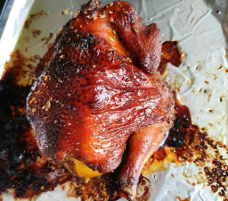 - 预热烤箱至200°C,将鸡放在旋转烤架上烤制1小时(期间可刷蜂蜜水增加风味)。