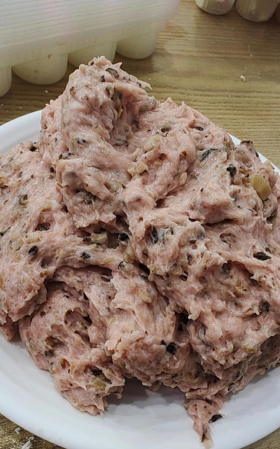 将莲藕碎、香菇碎与肉类混合,加入葱姜末、盐、生抽、香油、胡椒粉、五香粉等调料,顺时针搅拌至上劲。- 若使用素肉松,可加入增加口感。#### 3. 包制馄饨