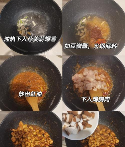 - 热锅凉油,先煸炒鸡肉至变色,加入姜蒜末、豆瓣酱、糖炒出红油。3. 炖煮汤底
