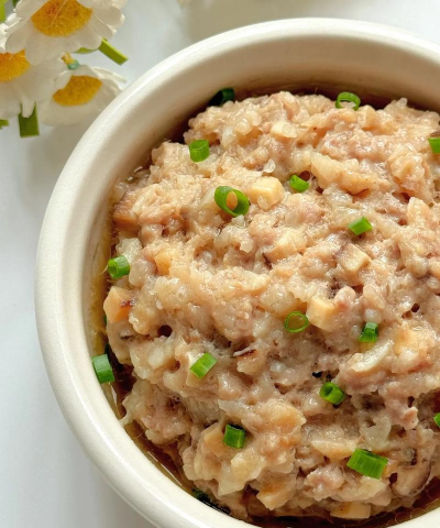 猪肉(150-200克):剁碎后与香菇丁(400克)混合