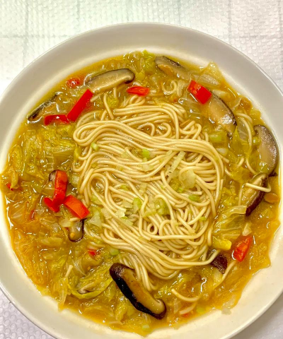 # 三、拌面与装盘混合食材:将煮好的面条与炒好的香菇油菜混合,淋上香菇汤(面汤与香菇汤比例7:3)。