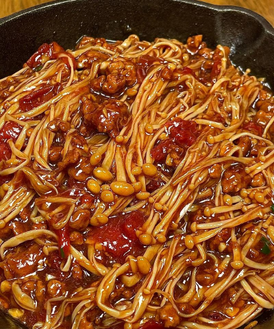 - 加入香菇片翻炒至软烂,再倒入炒好的肉末,翻炒均匀。5. 收汁装盘