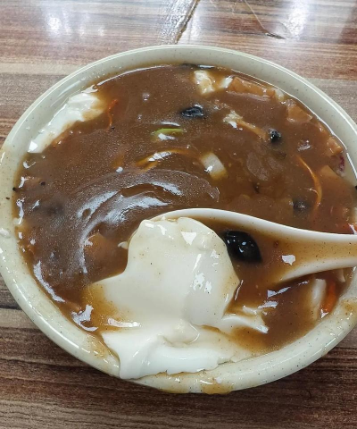 甜口豆腐脑:洁白细嫩的豆腐脑上,撒了白砂糖、山楂糕和葡萄干,红红绿绿的搭配在一起很诱人。趁热搅拌一下,呲溜一口香甜的滋味就在舌尖绽开,山楂微微的酸味还挺开胃。
