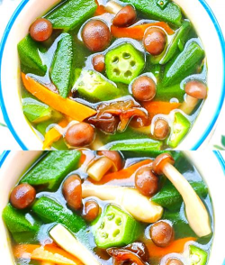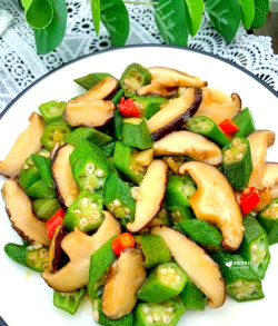 :秋葵焯水后(滚水煮2-3分钟)捞出,与香菇混合翻炒。- 调味收汁:加入蚝油、生抽、盐调味,翻炒均匀后勾薄芡(可用淀粉水),待汤汁浓稠后关火。