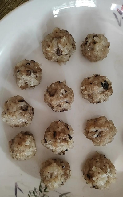 # 3. 搓丸与调味和面:将蒸熟的糯米晾凉后加入腊肠丁、香菇丁,加入葱姜末、盐、生抽、蚝油、花椒粉、胡椒粉等调料,顺着一个方向搅拌至上劲
