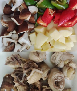 - 鸡腿用花椒、葱姜盐水浸泡去腥,香菇切片或切块。 - 芋头去皮切滚刀块,焯水备用。2. 组合: