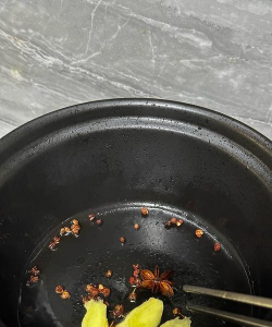- 锅中留底油,加入葱姜蒜末爆香,再加入八角、香叶、花椒翻炒出香味。