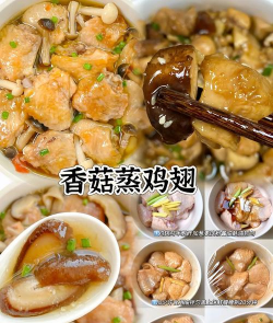 # 步骤 食材处理- 鸡翅中划两刀(口子要深),用盐和料酒腌制10分钟去腥提味。 - 鲜香菇切片(厚片更佳),铺在盘底,鸡翅放在香菇上,撒上姜丝。 - 蒸制时间:10-12分钟(根据鸡翅大小调整),大火蒸至鸡翅熟透透。2. 调味与装盘