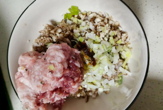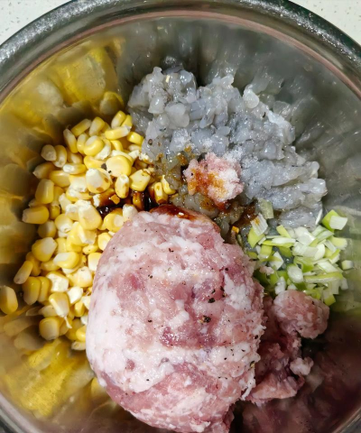 # 2. 混合馅料将虾仁、玉米粒、香菇丁与肉馅混合,加入蒜末、十三香粉,顺着一个方向搅拌至上劲。可适量添加鸡蛋提鲜。