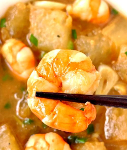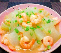 - 爆香蒜末、虾仁、香菇片,加入冬瓜翻炒至变色