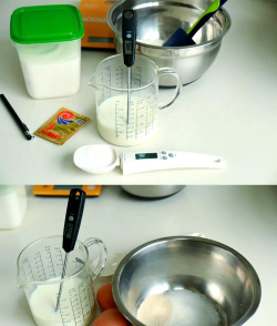 - 慢慢加入牛奶/水,边加边搅拌至面糊光滑无颗粒(稠度类似酸奶)