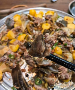 - 加入板栗和香菇,翻炒均匀后倒入适量清水,大火煮开后转小火炖煮。