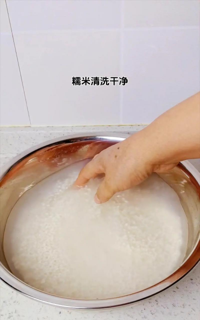 # 2. 糯米准备和面:将糯米粉加入温水(水量需根据糯米吸水性调整),揉成光滑面团。面团软硬程度以耳垂状为宜