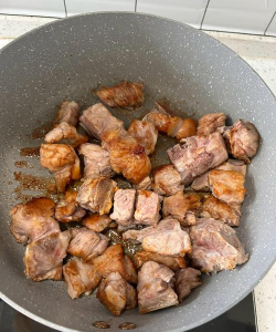 - 排骨焯水后放入砂锅,加入葱姜蒜、料酒、花椒、八角炒香;