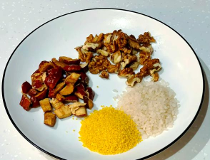 - 山药、红枣切块,核桃仁焯水去皮,小米浸泡30分钟。2. 分步熬煮