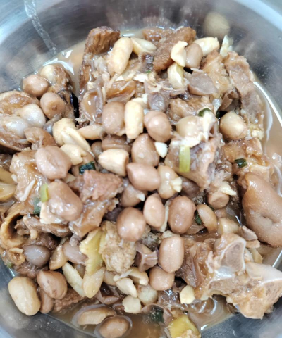 - 倒入花生、香菇,加入1升沸水,大火烧开后转小火慢炖1.5-2小时,直到猪蹄软烂。
