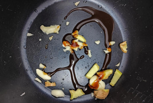 - 加入焯水后的猪蹄翻炒至表面微焦黄,再加入生抽、老抽上色。