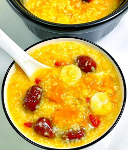 - 先下小米/大米,煮至微开后加入南瓜和山药;