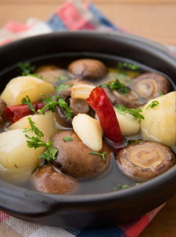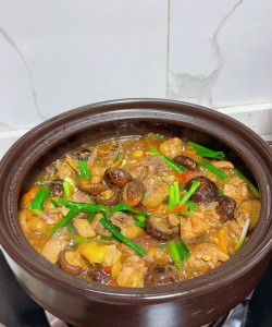 - 加入香菇和马蹄,继续翻炒均匀后倒入足量清水(没过食材),大火烧开后转小火炖煮1-1.5小时,直到鸡肉熟透且汤汁浓稠。